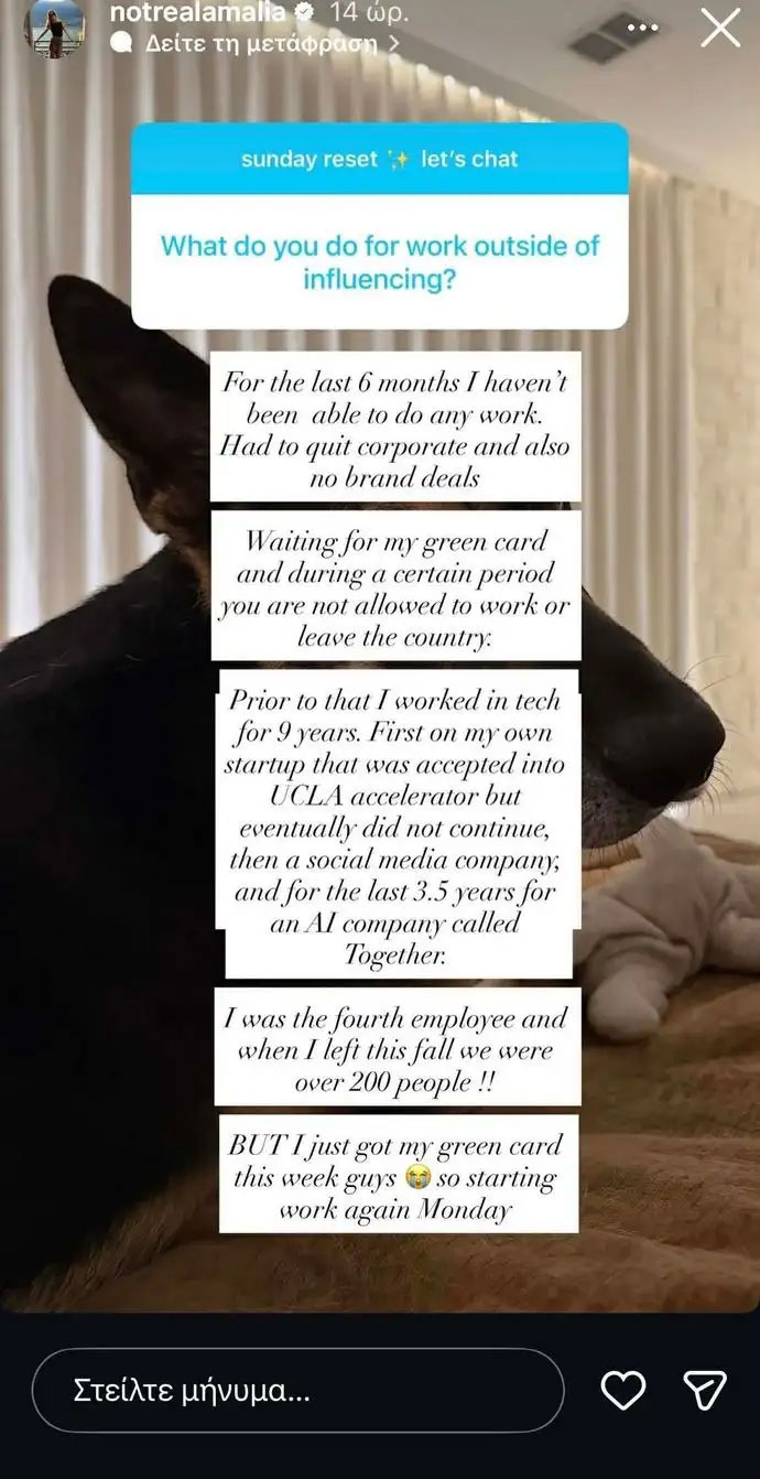 Μέσω ενός πρόσφατου βίντεο στο YouTube, αποκάλυψε ότι αναγκάστηκε να διακόψει τη δουλειά της για έξι μήνες, περιμένοντας την έγκριση της πράσινης κάρτας (green card).
