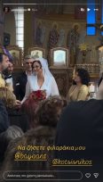 Συγκινημένη και με καθυστέρηση, η νύφη έφτασε στο ναό συνοδευόμενη από τον πατέρα της, τηρώντας την παράδοση. Κοντά στο ζευγάρι, βρέθηκαν οι οικογένειές τους και οι προσφιλείς φίλοι τους, μεταξύ των οποίων ο Γιάννης Αϊβάζης.