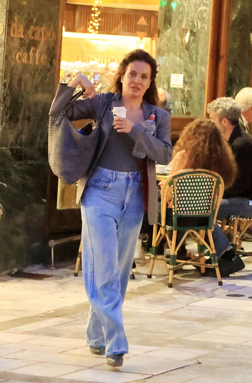 Φορώντας ένα τζιν παντελόνι και γκρι σακάκι, περιήλθε στους δρόμους του Κολωνακίου κρατώντας στον χέρι τον καφέ της και ένα μπουκάλι νερό. Η παρουσία της, αν και διακριτική, δεν πέρασε απαρατήρητη, καθώς η γοητεία της συνεχίζει να εντυπωσιάζει την ελληνική showbiz, ακόμη και χωρίς φτιασιδώματα.