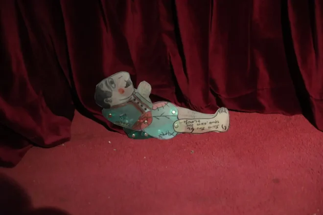 Σημαντική είναι η παρουσία μιας φιγούρας Καραγκιόζη στο φέρετρο, συνοδευόμενη από τη φράση: «Κείνο που με τρώει, κείνο που με σώζει…», γεγονός που προσθέτει στην ατμόσφαιρα συγκίνησης.