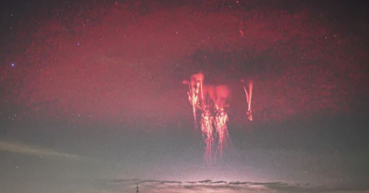 Στην φωτογραφία, παρατηρείται ένας κόκκινος δίσκος που μοιάζει να προέρχεται από άλλον κόσμο, με κεντρική του δομή να θυμίζει μέδουσα με πλοκάμια. Αυτή η εντυπωσιακή κατασκευή, γνωστή ως sprite, αποτελεί μορφή ηλεκτρικής εκκένωσης που όχι μόνο δεν κατευθύνεται προς το έδαφος, αλλά αντιθέτως ανέρχεται προς την ανώτερη ατμόσφαιρα.