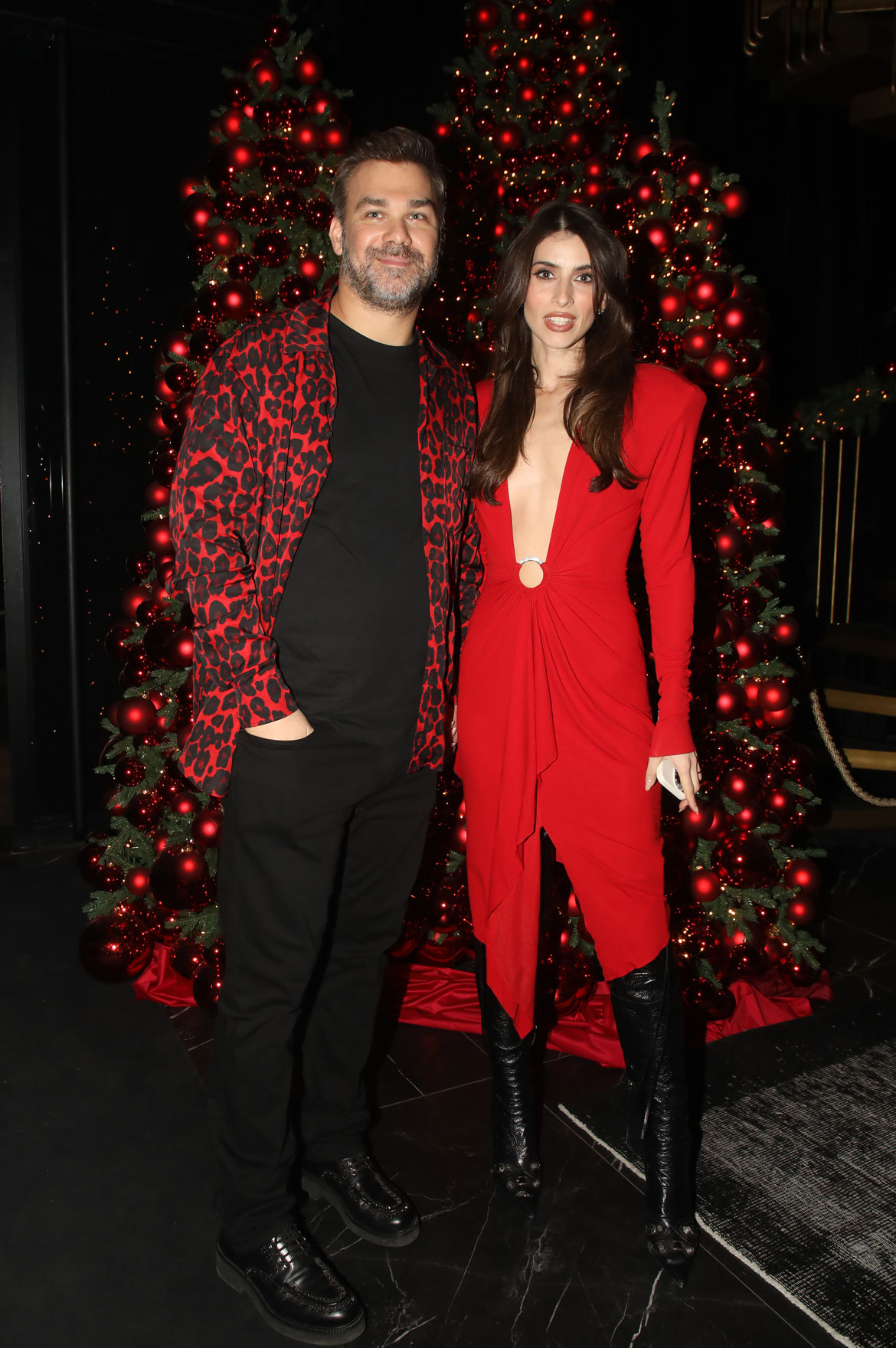 Η Ιωάννα Σαρρή, από την πλευρά της, ήταν πραγματικά εντυπωσιακή με την επιλογή του outfit της. Φ wore ένα υπέροχο κατακόκκινο φόρεμα με εκτεθειμένο ντεκολτέ, συνδυάζοντας το με κομψές μαύρες μπότες, δημιουργώντας μια στυλάτη και δυναμική παρουσία.