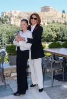 Δίπλα της βρέθηκε η κόρη της, Μαριτίνα Ντενίση, η οποία επέλεξε μια πιο μινιμαλιστική προσέγγιση. Το cropped σακάκι της, σε ουδέτερες αποχρώσεις, σε συνδυασμό με μαύρο παντελόνι, δημιούργησε ένα νεανικό και κομψό σύνολο, ιδανικό για μια πρωινή εξόρμηση.