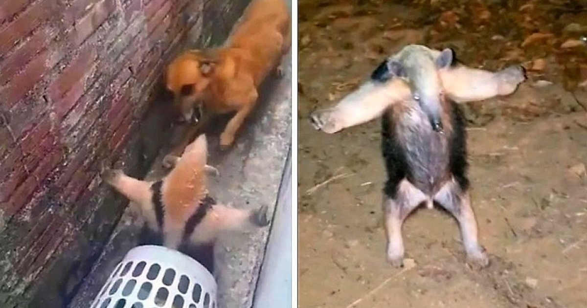 Σε μια απελπισμένη προσπάθεια να υπερασπιστεί το σπίτι του, ο μικρός σκύλος Ούρσο, αντίκρισε τον μυρμηγκοφάγο και αντέδρασε με θάρρος, επιδεικνύοντας επιθετική στάση. Παρά την αντίξοη κατάσταση, ο μυρμηγκοφάγος δεν έχασε την ψυχραιμία του. Ανοίγοντας τα χέρια του σαν σε μια σκηνή Κουνγκ-Φου, προχώρησε σε αμυντικές κινήσεις.