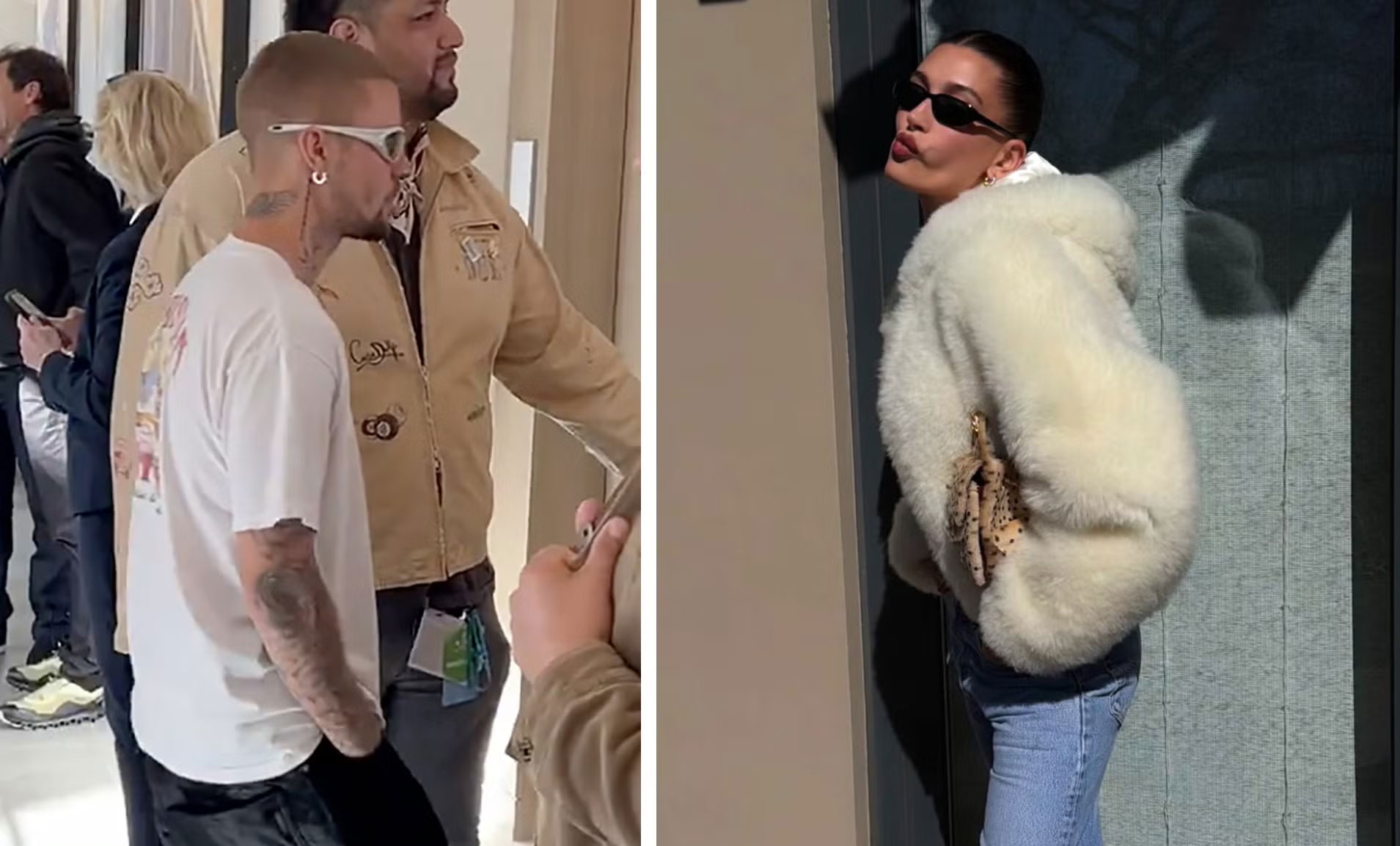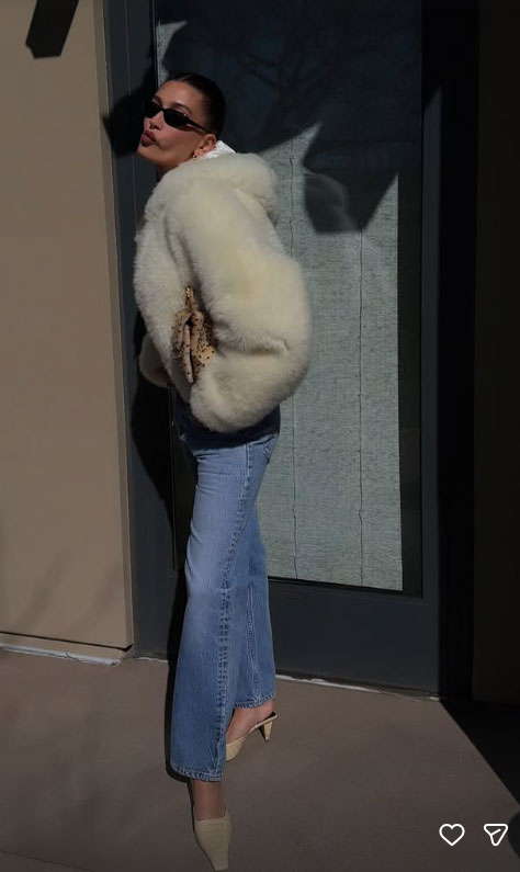 Η Hailey εμφανίστηκε με μια fluffy λευκή παλτό/γούνινες ζακέτες, καθοδηγώντας το look της, συνδυασμένο με ανοιχτόχρωμα jeans. Το outfit της ήταν chic και cozy, ιδανικό για μια VIP βραδιά στο Super Bowl, με minimal αξεσουάρ και sleek hairstyle.