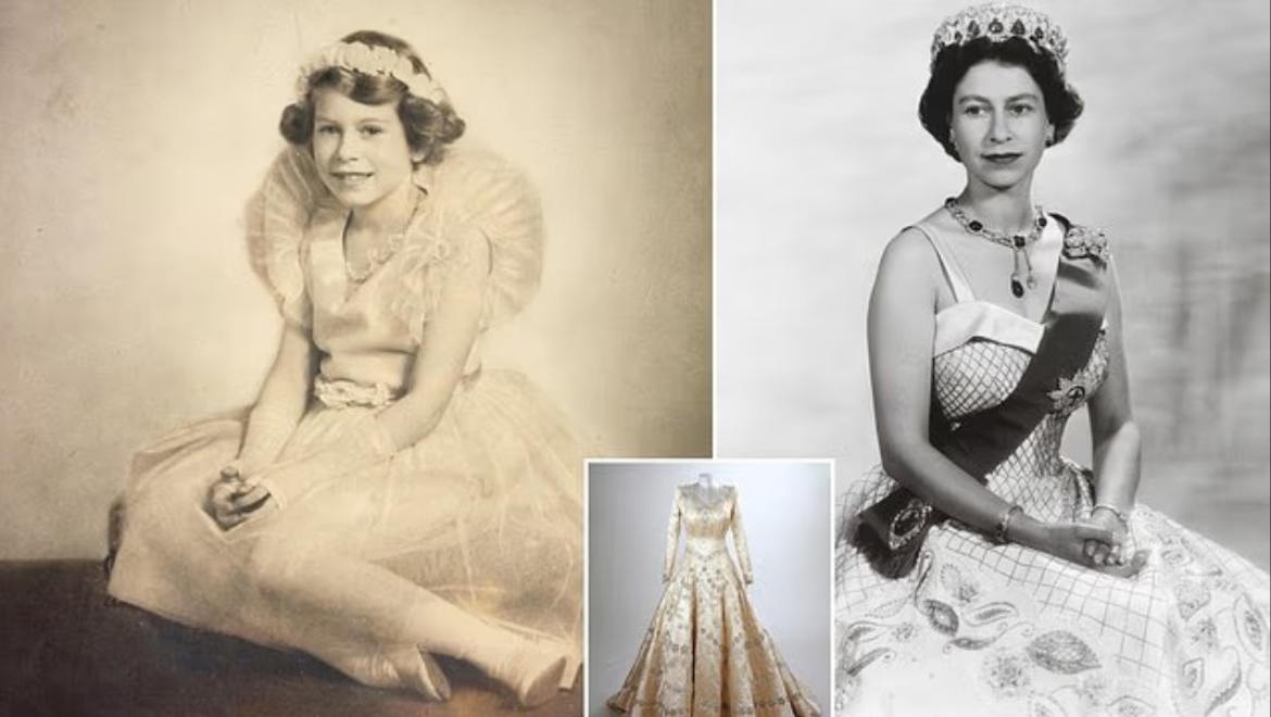 Σχεδιάστηκε από τον διακεκριμένο μόδιστρο Norman Hartnell, το εντυπωσιακό σατέν φόρεμα απαιτούσε τη συμμετοχή 350 γυναικών και τη χρήση 10.000 εισαγόμενων μαργαριταριών, μαζί με μια σειρά από ζυγισμένα σχέδια για τη διαδικασία δημιουργίας του. Το σχέδιο περιλάμβανε εντυπωσιακά κεντήματα που εξέφραζαν ελπίδες για μια νέα εποχή και τη θετική πορεία της νεαρής πριγκίπισσας στο μέλλον της βασιλείας της.